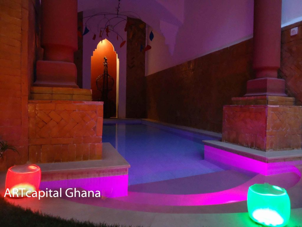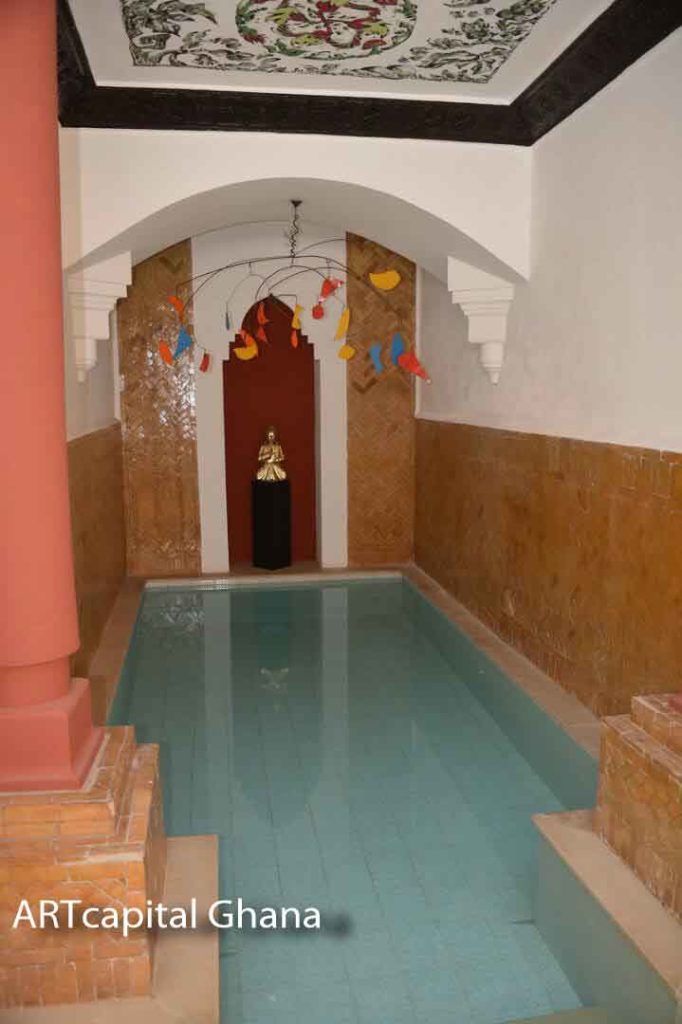 The recessed ceiling from the classic archway to the pool entrance has a large acrylic floral arabesque fresco executed in 2006, by the same artist, Edith Taïoni.