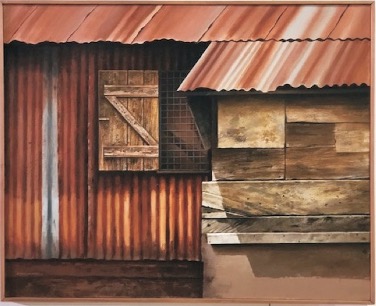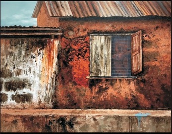 Through the application of ochre and browns in variegated shades with deliberate brush strokes and an uncanny cinematic use of sunshine and shadow, he is able to demonstrate the innovative improvisation and bricolage that almost always characterises the buildings.