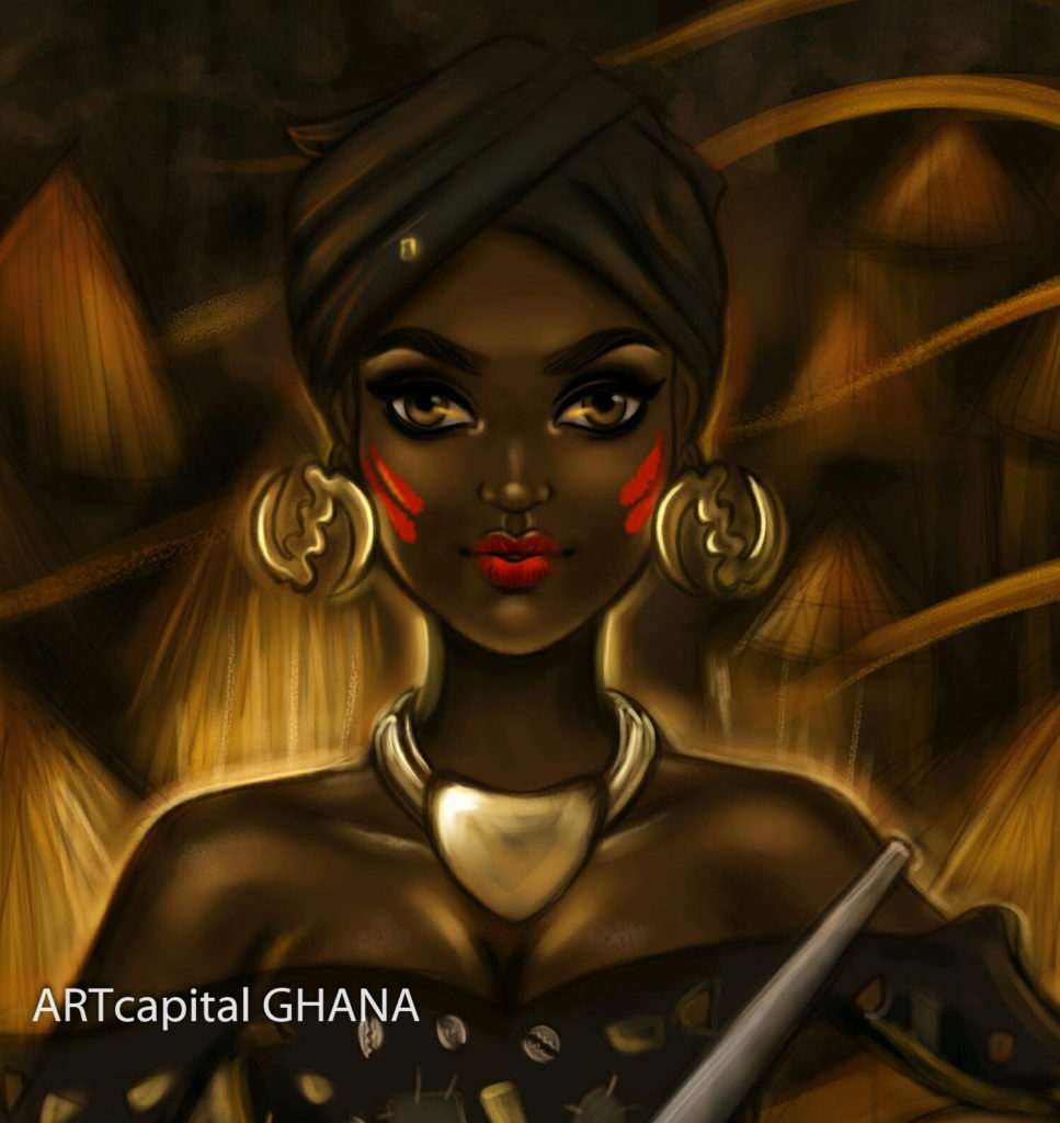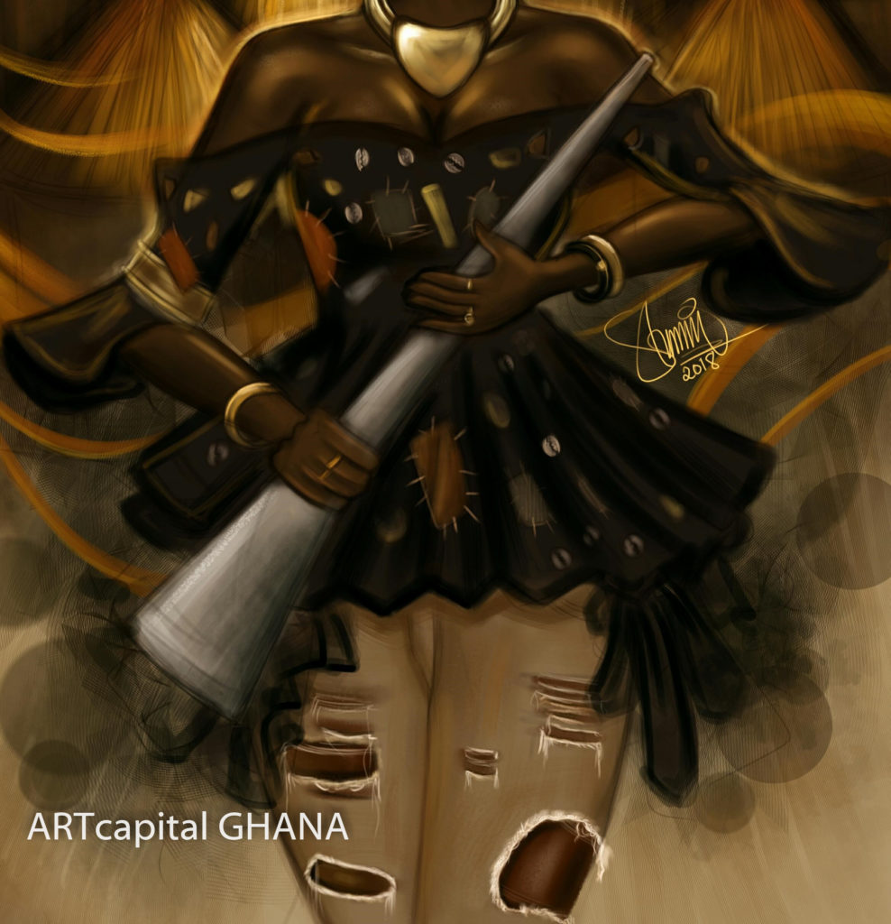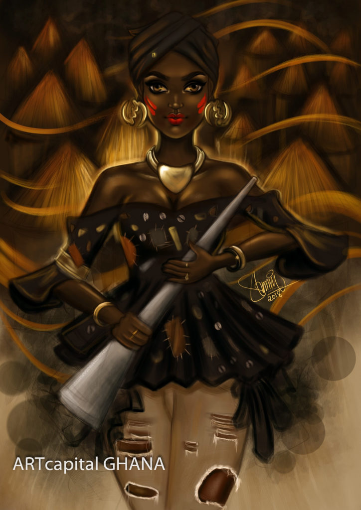Oduro references her sterling leadership, courage and military exploits by placing her in a batakari with powerful amulets.