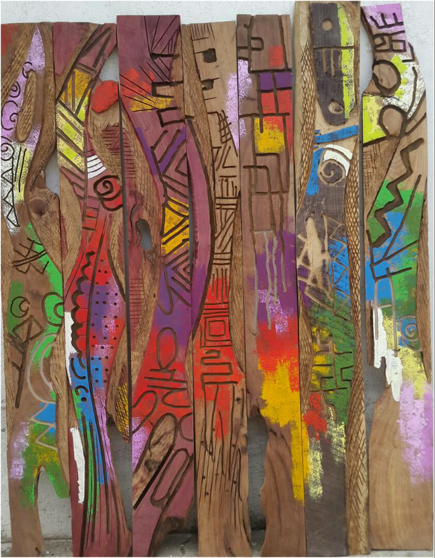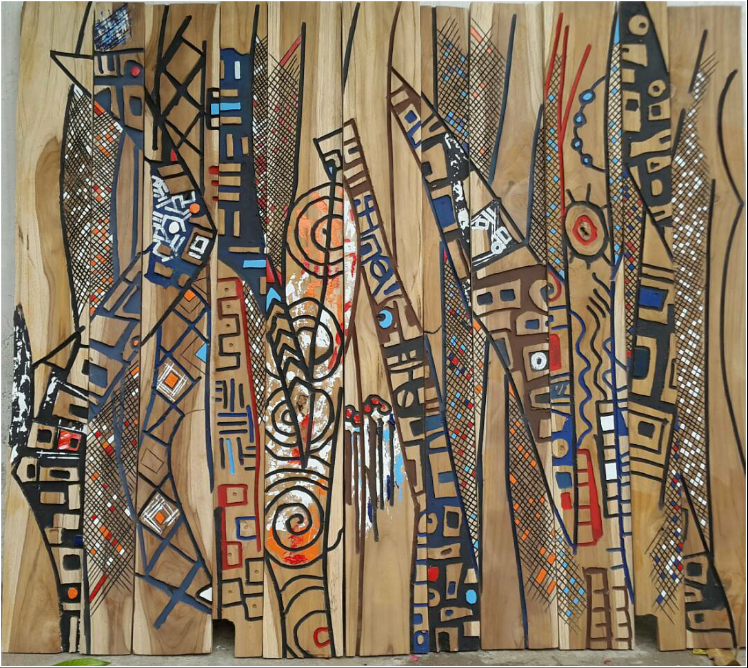 THE PAST IN THE BACKGROUND: Oko Matey, mixed media – discarded tropical rosewood and paint, 120 x 110 cm, 2018.