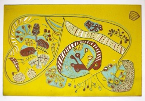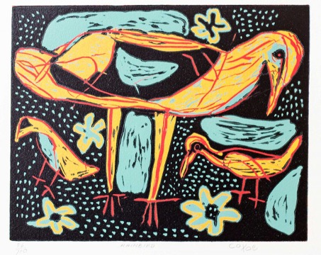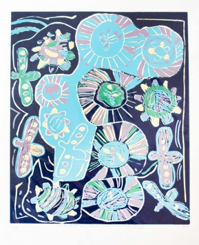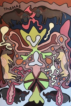It is only in the last thirty years that the complex iconography of San art- stylised animal and plant forms – first set down in rock paintings, carvings and body-art, has begun to be fixed in permanent and portable media, as paintings on canvas and prints on paper.