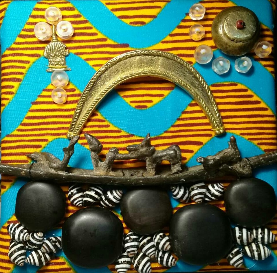 In DAY DREAMING ON THE RIVER NIGER, the beads appear as huge ominous boulders with the canoe (carrying humans and livestock) perched precariously on them.