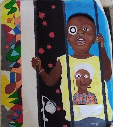 In one painting, a Generation Z individual stands imprisoned by the Covid-19 virus, his face transmitting mild one (natural) eyed amusement; the elderly face placed on his torso appears worried perhaps confirmed by a wilted flower in the foreground.