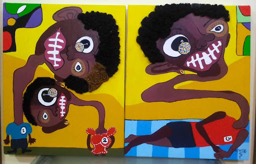 In the diptych entitled CHARACTER, the distortion in one half seems to be complimentary for the pair of figures. The artificial hair remnants glued on the figures gives them a realism which also resonates with the artist’s vocation as a hairdresser.