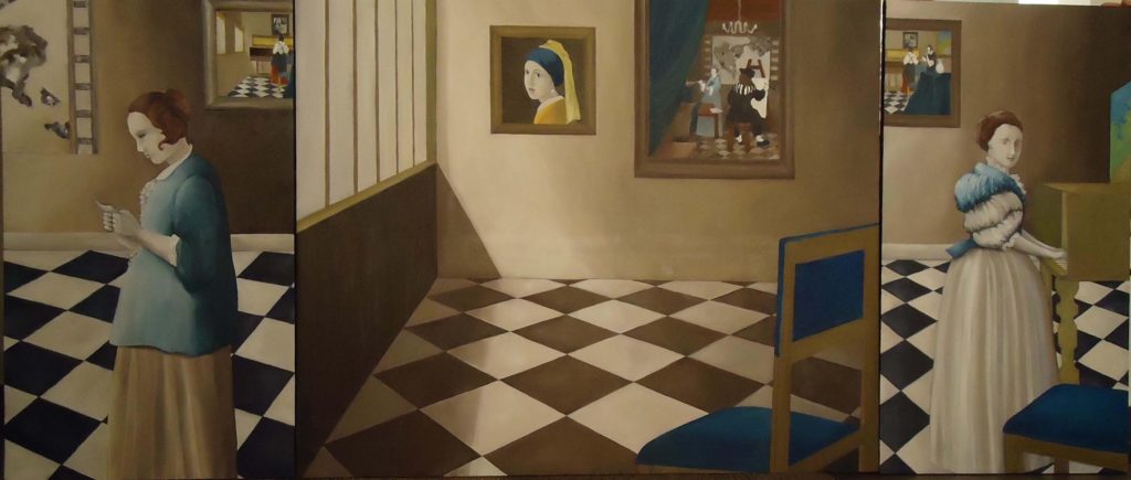 Taïoni tap dances effortlessly and captures his ambience….the result, a triptych, “Tribute to Vermeer”.