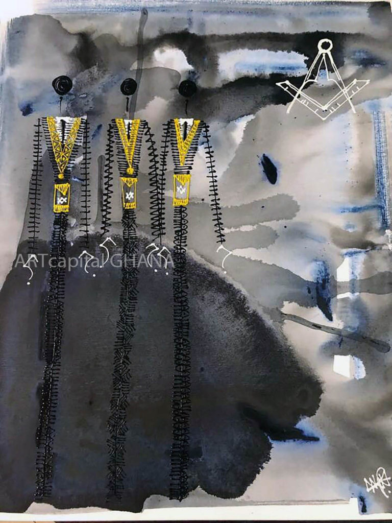 THREE MASONS: Naaki Narh, acrylic on canvas, 90 X 75 cm, 2018; signed lower left. Courtesy of the artist.