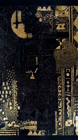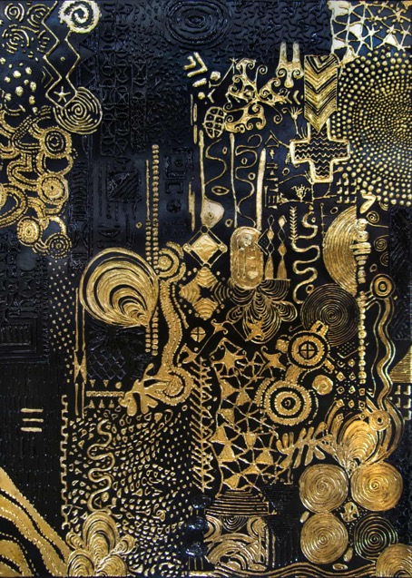 The result is work that is fresh -searingly original and contemporary; cosmic in scope with hieroglyphic features that recall myriad forms, from several cultures; from the Aboriginal Dreamtime paintings, baroque art, mandalas to West African textiles and cryptic Leopard secret society ideograms.