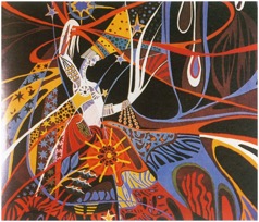 The mass of lines radiating out from and intersecting the figure create a sense of woven threads, integrating the figure within the pictorial field.”