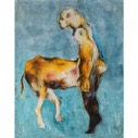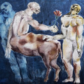 In one painting, the centaur presents flowers; the gesture is loaded with meaning at several levels.