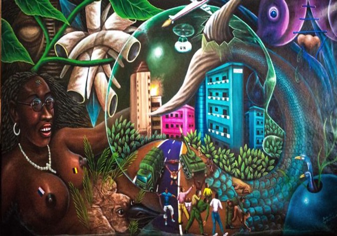 Surrealistic elements abound in his paintings as a tool to interrogate secular, religious and moral issues from a modern perspective. His use of color is brash, his brush strokes are strident and his detailing emphatic.