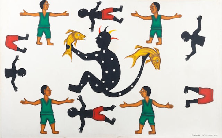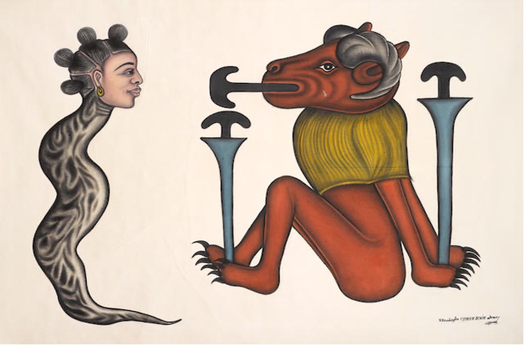 Takoudagba’s canvases reference his early temple and palace murals; strange menacing animals and poignant symbols suspended against a white backdrop, making them timeless and mystical; each a reverential ode to the resilience of Fon ideas and true African philosophy.