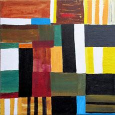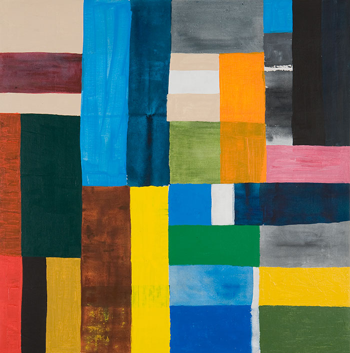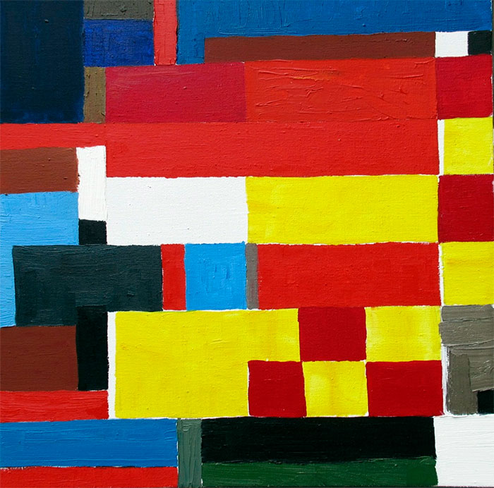Reminds me a little of Piet Mondrian except PM draws straight black lines for definition and doesn’t use quite so many colours in one painting.