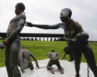 Kwame Akoto-Bamfo’s powerful sculpture at the National Memorial for Peace and Justice. Rust from the chains drips down the bodies of the enslaved figures.