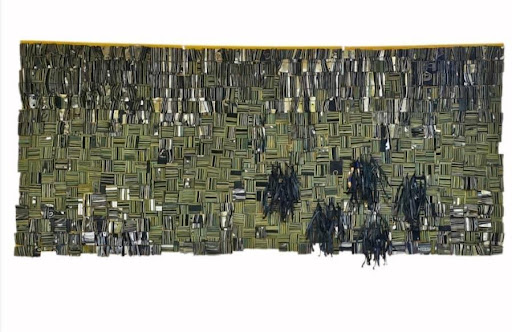 The first group of artworks consist of the famous genre of pieces that have been subjected to Tagoe-Turkson’s “transformative alchemy” – his meticulous craftsmanship whereby the plastic pieces of discarded flip flops on our beaches are morphed into monumental wall hangings.