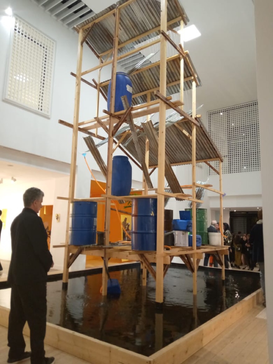 The monumental installation Lluvia (Rain) by Daniel Otero Torres featuring a rainwater recycling system composed of streams of water and a variety of perforated metal and plastic drums asked poignant questions about the politics of space and place.