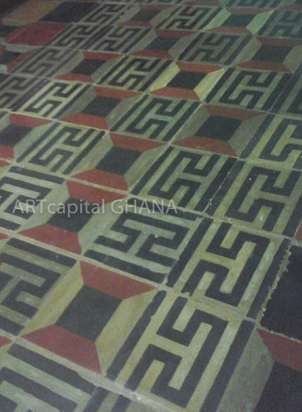 LIVING ROOM FLOOR – BHAMIYEE HOUSE, KROBO-ODUMASE, 2019. The concrete hand pigmented tiles are over 100 years old. Today such tiles are made only outside Europe on account of production costs.