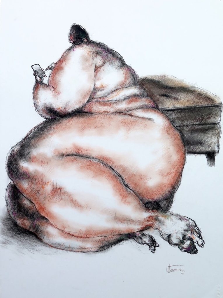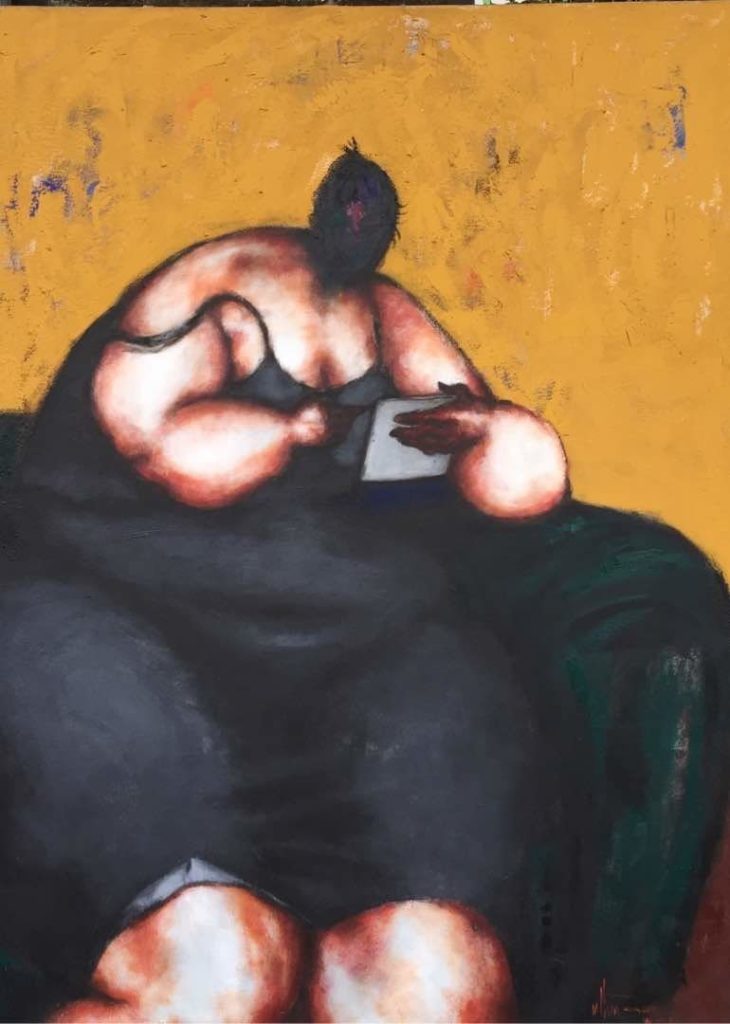 But Wahaab goes further by showing through his nuanced paintings a resplendent corpulence- an exaggerated rotundness punctuated by phenomenal luxury and wellbeing; elegant high end furniture, jewelry, well manicured hands and feet together with other trappings of modernity such as smartphones.