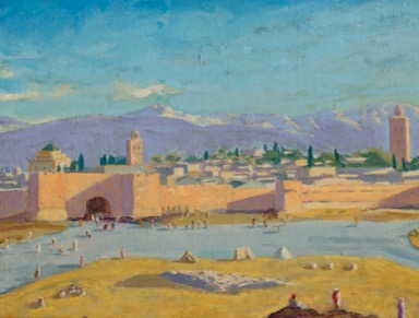 The painting SCENE AT MARRAKECH highlights “the chromatic intensity of the warm desert sand, which harmoniously contrasts with the blue stream in the foreground. The vivid greens of the vegetation in the background also bring color, life and energy to the otherwise typically sparse landscape of this scene in Morocco.”